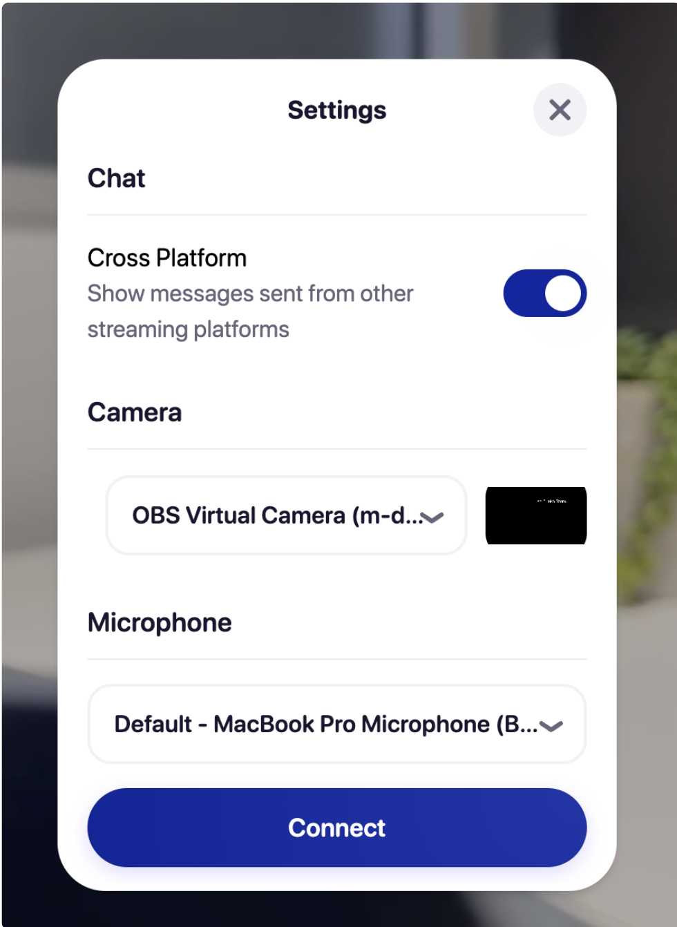 From the Settings prompt, you’ll be able to select your OBS Virtual Camera by clicking on the dropdown. Note: If you don't see this option, you may have to refresh your browser.